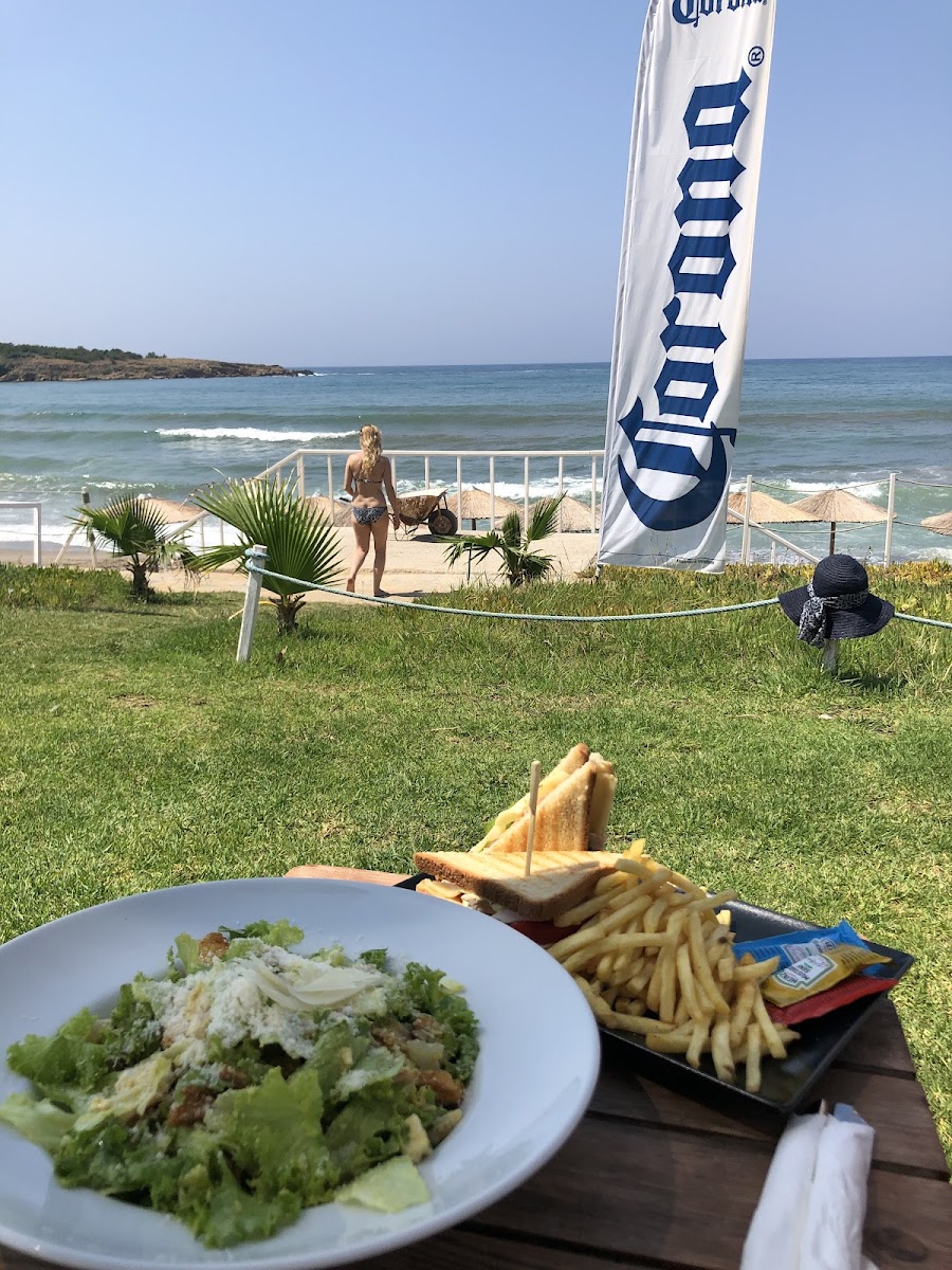 Great beach bar! Beautiful and a very relaxing vibe, in a shade with a little breeze, and a view to the beach. The food is delicious and pretty. Minuses: a bit slow service, yet friendly and nice. Could add oat milk as a substitute for cow’s milk for coffees. I’ve had bruschetta and mushroom risotto, both were very flavorful.